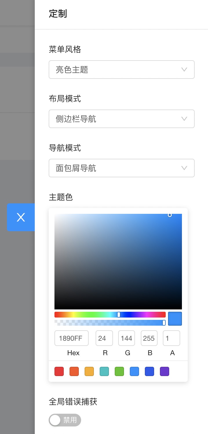 主题色,默认是跟随 ant-design-vue 的主题色 #1890ff,自定义主题色时,主色值只需要修改这一个地方即可,然后在 config/config.s 下的 modifyVars 字段中配置自定义的主题色变量。跟自定义主题色相关的改动,一般也只需要改动这两个地方即可。