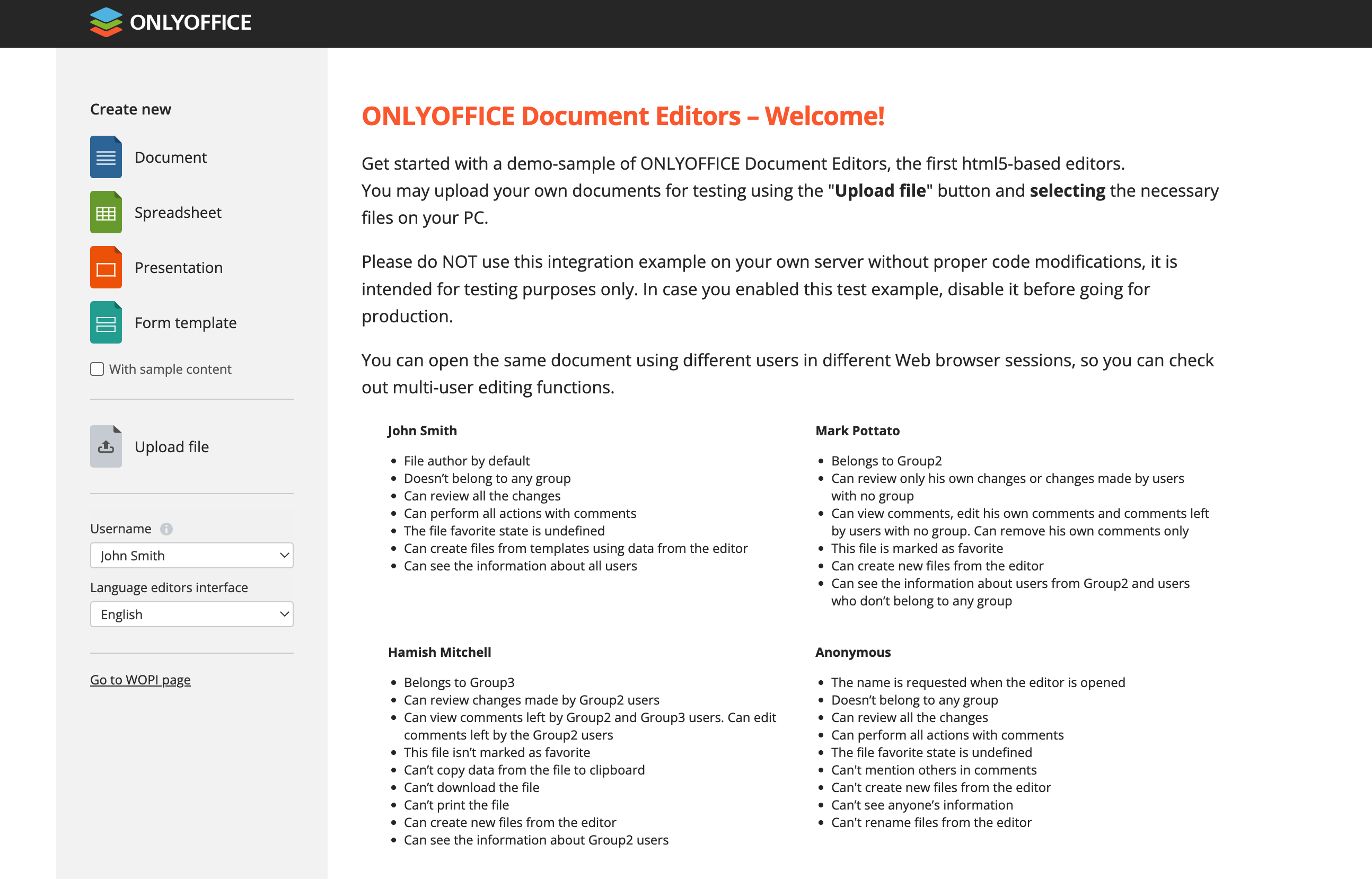 最后访问 http://IP:8701/example 页面(这里要注意,IP 不能是 localhost 和 127.0.0.1,一定要用真实 IP 来访问),看到下面的这个效果说明 Onlyoffice 启动成功: