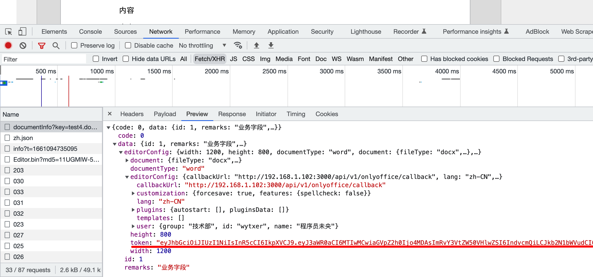 然后刷新使用 JWT 加密 Onlyoffice 配置示例页面,可以看到获取到的数据里面已经带了 token 参数: