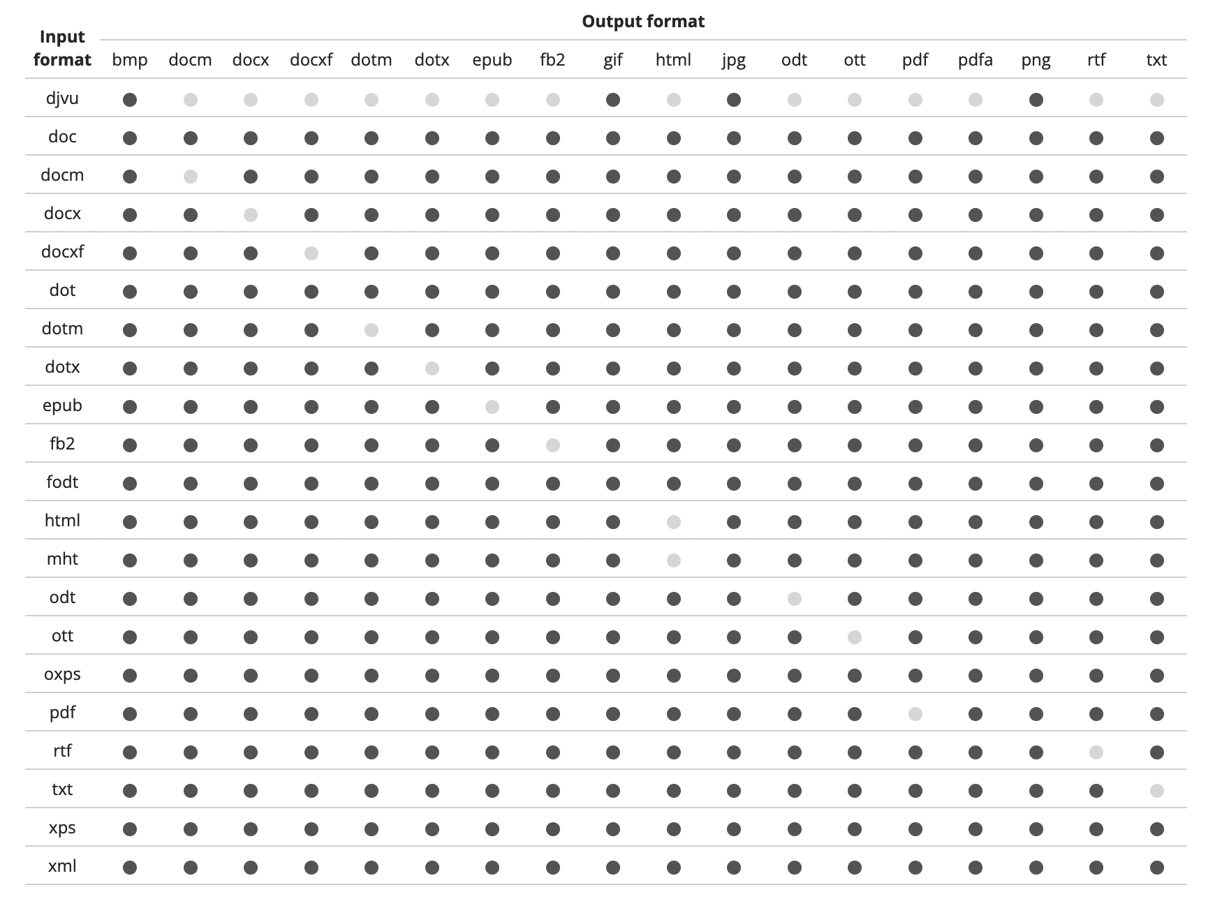 Onlyoffice 支持不同文档类型之间相互转换,比如将 docx 格式的文件转成 pdf 格式。以下是各个文档类型之间转换的对照表: